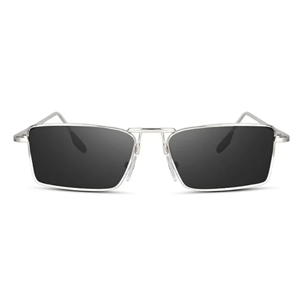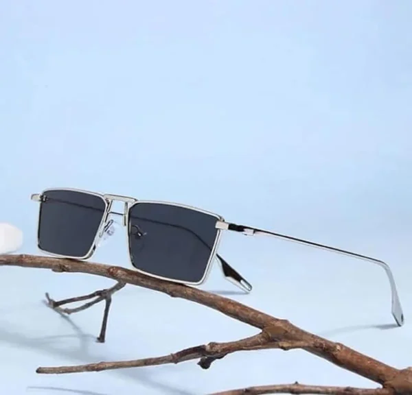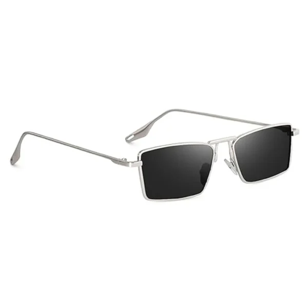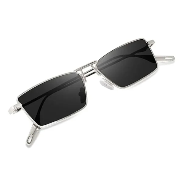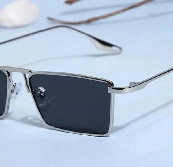 These sunglasses feature a sleek silver metal frame paired with rectangular black lenses, giving them a sharp and contemporary appearance. The slim construction makes them lightweight and comfortable for all-day wear, whether you’re commuting, driving, or heading out casually.