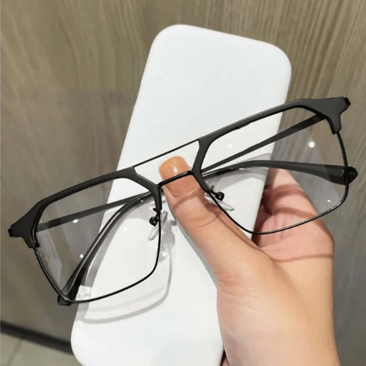 The sleek square shape enhances facial features and gives a modern, professional appearance. Adjustable nose pads ensure a comfortable fit, while slim metal temples provide stability without pressure.