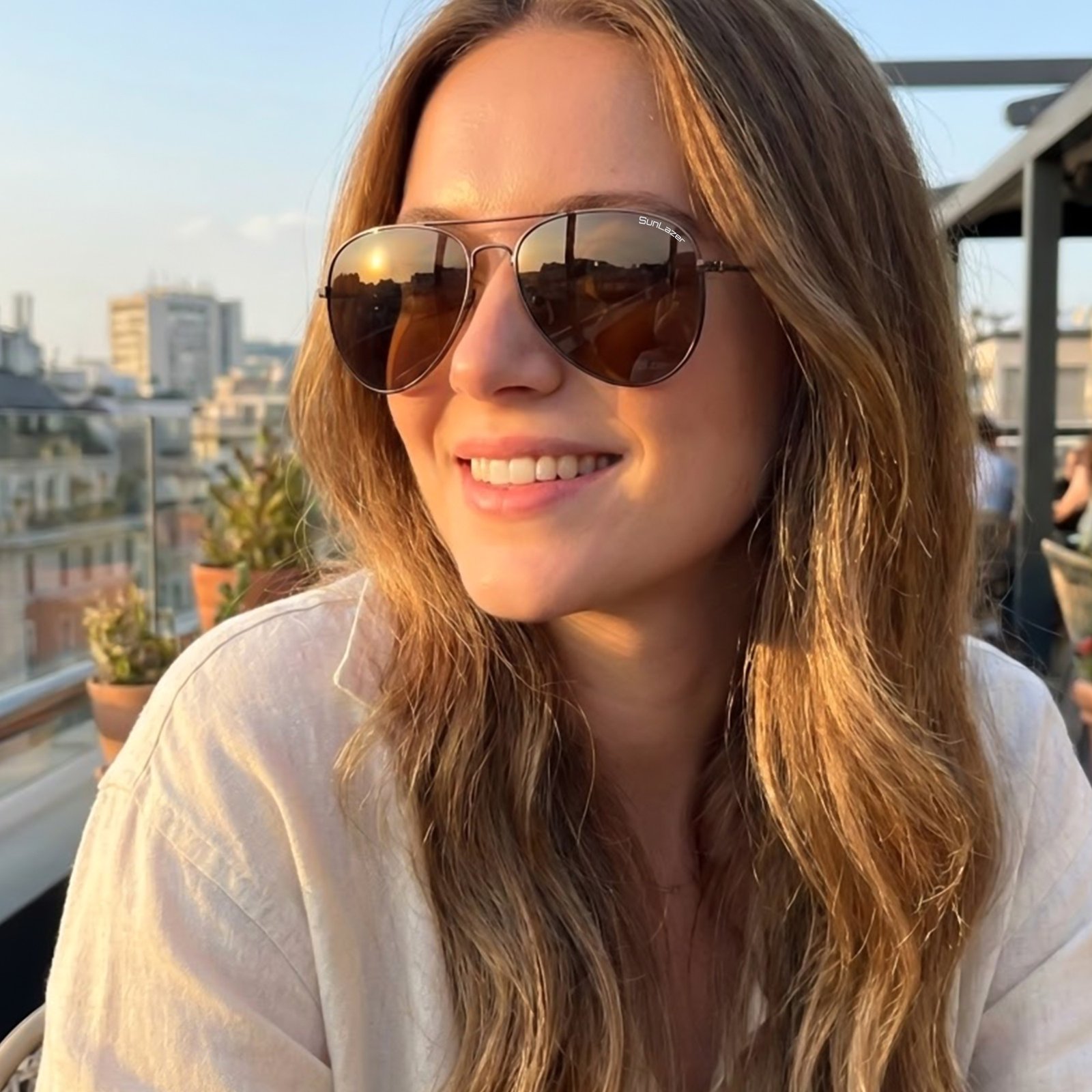 Sunlazer These classic aviator sunglasses feature a timeless design combined with modern comfort. Crafted with a lightweight and durable metal frame, they are comfortable for all-day wear. The green-tinted lenses help reduce glare and provide clear vision in bright sunlight while protecting your eyes from harmful UV rays.