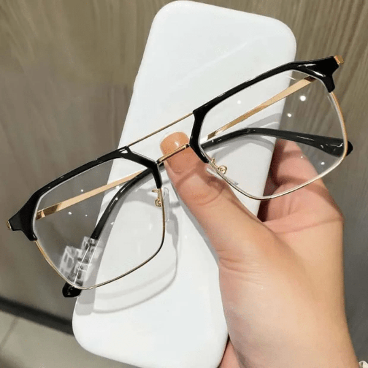 The sleek square shape enhances facial features and gives a modern, professional appearance. Adjustable nose pads ensure a comfortable fit, while slim metal temples provide stability without pressure.