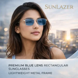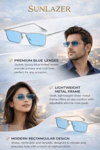 These sunglasses feature a sleek silver metal frame paired with rectangular blue lenses, giving them a sharp and contemporary appearance. The slim construction makes them lightweight and comfortable for all-day wear, whether you’re commuting, driving, or heading out casually.