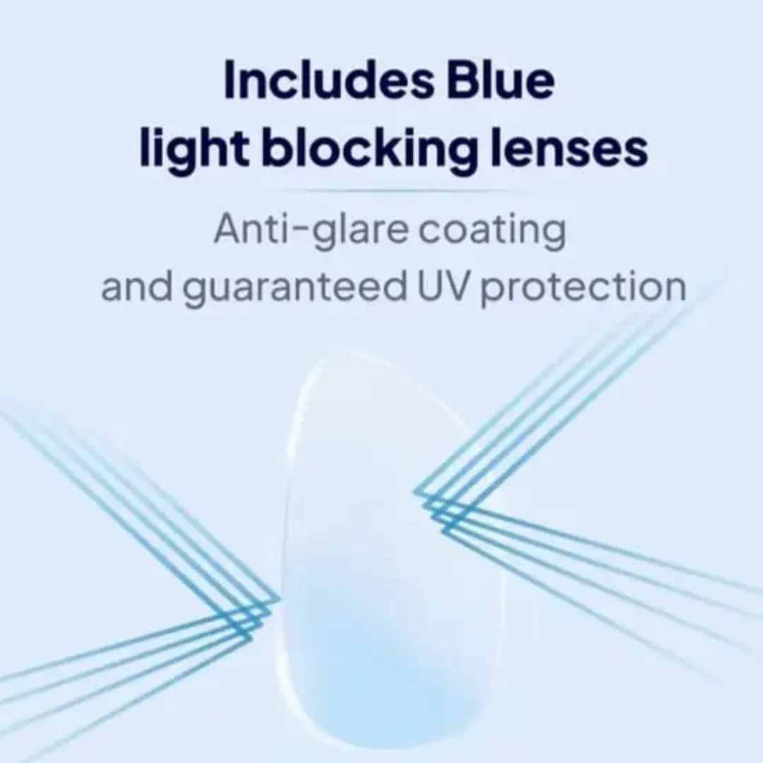 The premium anti-blue light lenses help reduce harmful blue light exposure from mobile phones, laptops, and LED screens, minimizing eye strain, dryness, and fatigue. Crafted with lightweight yet durable materials, the ergonomic design ensures all-day comfort without pressure on your nose or ears.